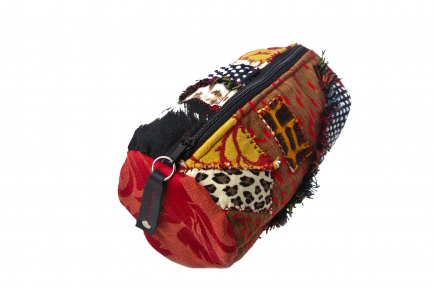 Unique patchwork design was made with scraps of upholstery fabrics and ultrasuede. Zipper top closure. Prints range from polka dot, solids, bold prints, cheetah and zebra design. Has a fun bohemian feel to it. Great for make up or small gadgets.