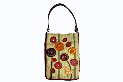Poppies were hand cut and attached with silver rivet centers. Bird was sewn with black thread on a commercial machine. Leather handle.