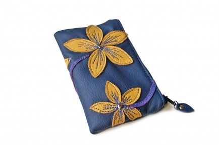 Hand cut yellow leather flower petals were appliqued to a leather background with blue stitching. One of a kind design. Inside is lined with bright yellow microfiber material. Perfect for cards, money, phone, or camera. Measures 4.25 x 6.75 inches. Handmade leather zipper pull.