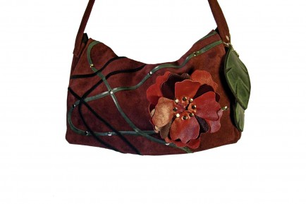 Main Body of bag is made with suede burgandy suede. The flap of bag is decorated in strips on green and black leather and accented with silver rivets. Large leather rose blossoms are the main focus of this bag. I added some leather leaf accents on one side of bag handle which can be removed.