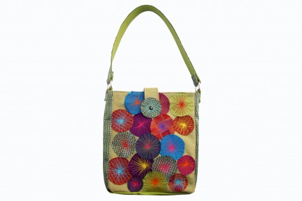 Main Body is made with reclaimed green upholstery vinyl. Scraps of different colors and textures were cut in circular shapes and stitched with contrasting thread.
