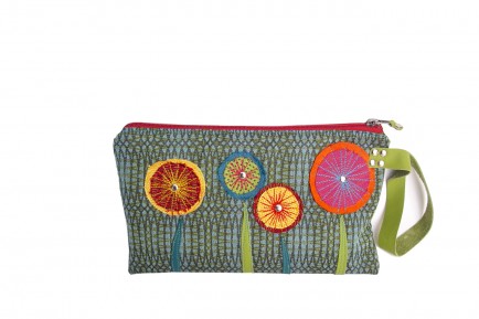 Made from upholstery scraps. Fabric flower accents are each individually hand cut and stitched on commercial machine with contrasting thread. Inside is fully lined and also includes a inside zipper pocket. Zipper top closure with a leather zipper pull. Use as a makeup case, wallet, phone, camera, money or for smaller items that you want to secure inside of a larger bag. Perfect when you dont want to carry a big bag. No 2 bags are ever the same.