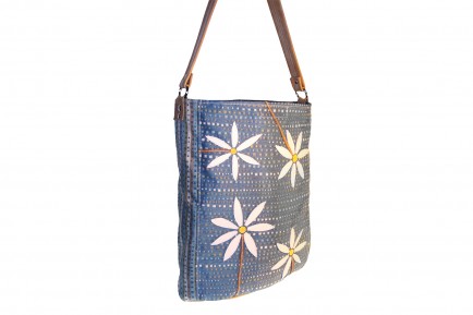 Made with upholstery background. White leather daisies were hand cut and applied using a commercial sewing machine. Tan distressed leather strap.