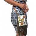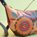 Made with a remnant scrap of beautiful dark cherry glossy leather. The straps were made with dark coal leather of a different grade. Handcut flowers in black and gray were layered and stitched to background of bag with a commercial sewing machine. Black, gray and blue gray stitching. Leather zipper pull. Inside is fully lined with black fabric. Includes 2 open slip pockets measuring 5″ deep and one zipper pocket.