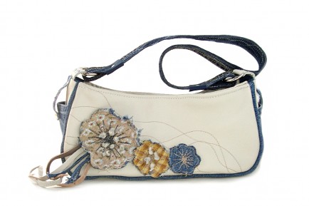 Made with recycled denim and cream leather and accented with handmade cotton and denim blossoms. Leather and denim strips of fringe dangle from the largest blossom. Side pockets with snap closure. Denim Handle stitched with tan and cream thread.