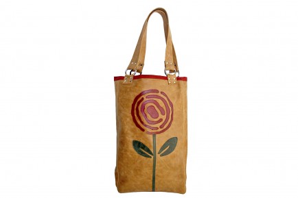 Made with tan distressed leather as the main background. Red leather was hand cut and stitched with a commercial machine. Leather handles, upholstery lining. Magnetic top closure.