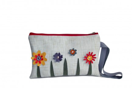 Fun and functional. Perfect when you dont want to carry a big bag. Bright colorful flower accents are each individually hand cut. Inside is fully lined and also includes a inside zipper pocket. Zipper top closure with a leather zipper pull. Use as a makeup case, wallet, phone, camera, money or for smaller items that you want to secure inside of a larger bag. No 2 bags are ever the same.