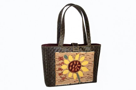 Made with Brown Waffle Printed Vinyl background. Leather petals and letters were hand cut and machine stitched.
