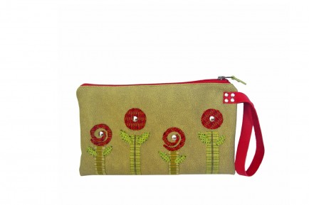 Made from green upholstery vinyl. Fabric accents are each individually hand cut and stitched on commercial machine. Inside is fully lined and also includes a inside zipper pocket. Zipper top closure with a leather zipper pull. Use as a makeup case, wallet, phone, camera, money or for smaller items that you want to secure inside of a larger bag. Perfect when you dont want to carry a big bag. No 2 bags are ever the same.