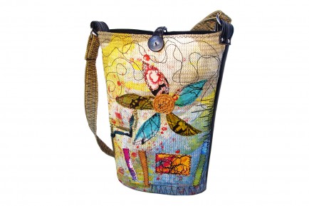 Made with scrap upholstery and vinyl. The upholstery background was painted with artist acrylics. Fabric and leather applique work with thread painted accents. Reverse of bag is in a solid high quality black upholstery vinyl Strap is made from upholstery which was stitched in a zig zag design the entire length.