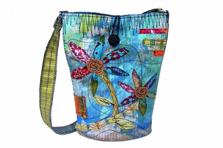 This bag is handmade with scrap upholstery and vinyl. The upholstery background was painted with artist acrylics, then stitched with thread for added depth and interest. Detailed applique work was then added with scrap fabrics which were machine stitched on a commercial machine. Reverse of bag is in a solid high quality black upholstery vinyl. Bottom is lined with a solid piece of recycled plastic sintra signage material