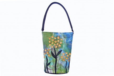 This bag is handmade with scrap upholstery and vinyl. The upholstery background was painted with artist acrylics, then stitched with thread for added depth and interest. Detailed applique work was then added with scrap fabrics which were machine stitched on a commercial machine. Reverse of bag is in a solid high quality black upholstery vinyl. Bottom is lined with a solid piece of recycled plastic sintra signage material