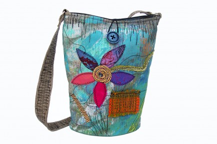 This bag is handmade with scrap upholstery and vinyl. The upholstery background was painted with artist acrylics, then stitched with thread for added depth and interest. Detailed applique work was then added in a single daisy flower design with scrap fabrics which were machine stitched on a commercial machine. Each petal is made with a different color fabric. Reverse of bag is in a solid high quality black upholstery vinyl. Bottom is lined with a solid piece of recycled plastic sintra signage material