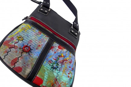 Made with scrap upholstery that I hand painted. I accented the background with hand beadwork and colored yarn. I added a large pocket with a contrasting red zipper and vinyl strip up the center.