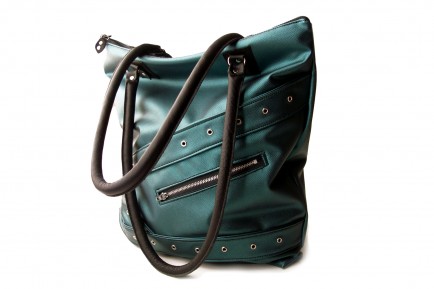 This x-large bag is made with industry scrap upholstery vinyl and leather. Beautiful heavy duty teal shimmery viny was used for this bag. Accented with silver eyelets and silver zipper. Zipper top closure.