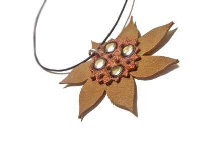 Sunflower pendant necklace. Made with leather and silver rivets.