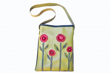 Made with green vinyl upholstery fabric. Scraps of green printed fabrics were cut for the stems and leaves and sewn a commercial machine. Flower centers were sewn in circular pattern with contrasting thread and finished with a silver rivet.