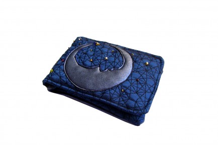 Made with blue upholstery fabric. Metallic blue moon was sewn and I hand stitched colored glass beads to the background for some sparkle and color