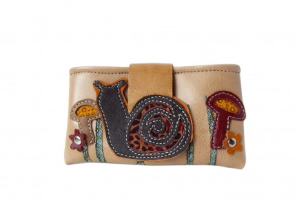 Small vinyl and leather Phone case/pouch with snail snap fastener. Applique work is made from leather and upholstery fabric