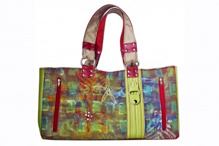 Brilliantly colorful painted tote. Painted upholstery fabric was recreated into something spectacular using homemade rubber stamps and extensive thread detailing for greater interest. Lime green vinyl was stitched in zigzag and straight pattern with contrasting thread. Silver hardware and zippers were added for fun in all the right places. Love this bag! One of my favorites!!