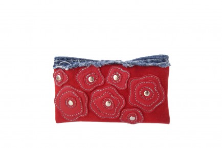 Made with microfiber, recycled denim and leather. The main body is made of microfiber, small scraps of red leather were hand cut and layered to form a rose design. Stitched on a commercial machine with white thread and finished with silver rivets. Reverse is made with recycled denim and denim snap tab closure. Perfect for a phone or small camera.