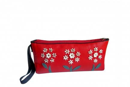 Made with red vinyl. Full gusseted clutch with leather applique accents.