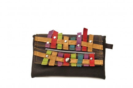 Made with reclaimed brown high quality vinyl. Pieces that were not suitable for a large production manufacturer were salvaged and used to make this one of a kind wallet. Scraps of leather were cut and stitched to form and cross hatch design. 2 Large inside pockets, one outside zipper pocket. Snap closure. Lined with soft microfiber fabric.