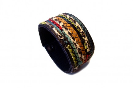 Made with ultrasuede, vinyl and leather scraps that were secured to a leather band with a zigzag stitch in black thread. Heavy duty snap closure.