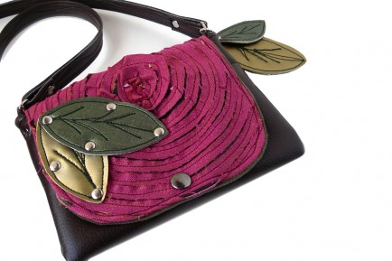 Made with brown vinyl for the main body. Flap was made with strips of pink upholstery that were sewn in a circular pattern. Green Vinyl leaf accents dangle from one side. Snap closure.