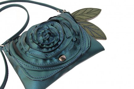 Made with metallic teal vinyl for the main body. Flap was made with strips of vinyl that were sewn in a circular pattern. Green Vinyl leaf accents dangle from one side. Snap closure.