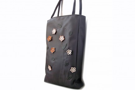 Made with dark gray vinyl and leather blossom details. White stitching was used for flower stems and silver rivets added to flower centers. Open top, no closure, x-tra deep, perfect for books or as a shopper tote.