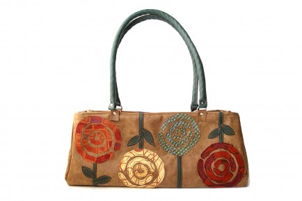 Made with distressed tan leather. Detailed applique rose design was finished on a commercial machine in printed upholstery fabric. Stems were cut in green leather and sewn with tan thread. Zipper top closure. Rope covered leather handles. Measures approx. 16 x 7.25 x 3 depth