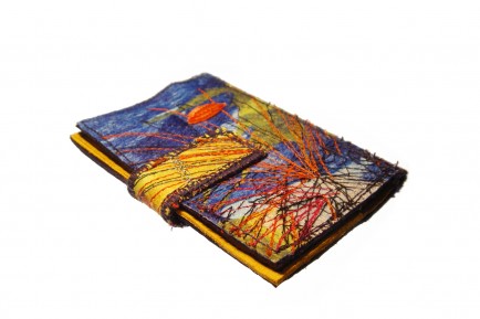 Front cover is made by fusing recycled and dyed dryer sheets and thread painting to add firmness and structure.