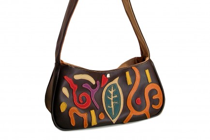 Main body is made with brown vinyl. Leather shapes were randomly cut by hand and sewn on a commercial machine.