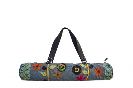 Made with scrap upholstery and leather. Detailed applique work is sewn on a commercial machine and made with a mixture of scrap decorative fabrics. Edges were left raw with a frayed look and will continue to fray over time adding to the character of the bag. Inside is lined with black fabric and includes one zipper pocket for keys, small wallet or phone. Inside Pocket measures 3.25 x 7.75 inch. Zipper Bag Measures approx 25″ from end to end and will hold a yoga mat measuring 24 x 68 inches. Handles are made from black suede strips and attached with silver d-rings. Suede leather handles are 1.25″ wide x 23.5″ length with a 10.5″ drop